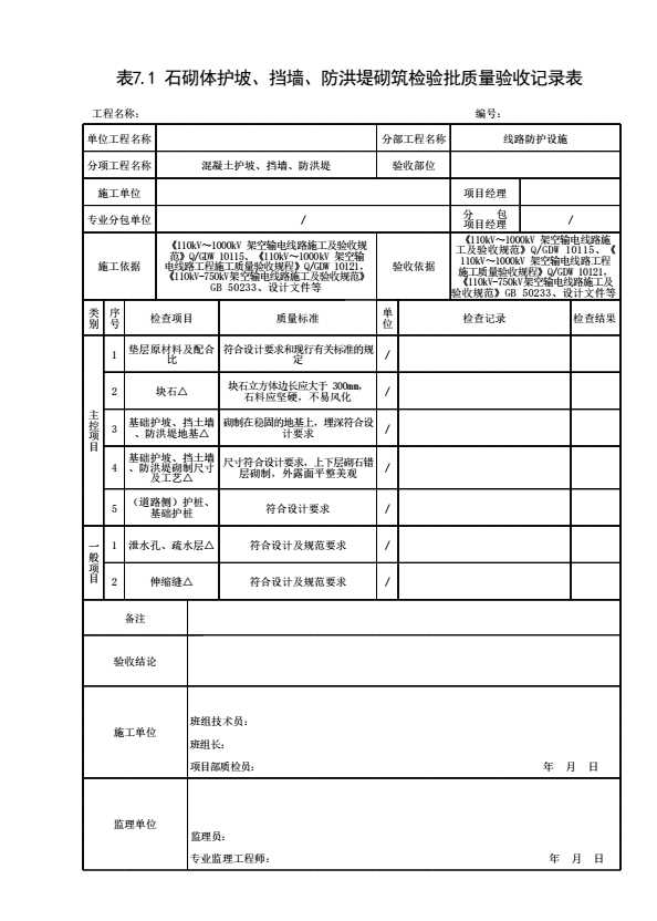 表格名称:表7.1 石砌体护坡、挡墙、防洪堤砌筑检验批质量验收记录表
