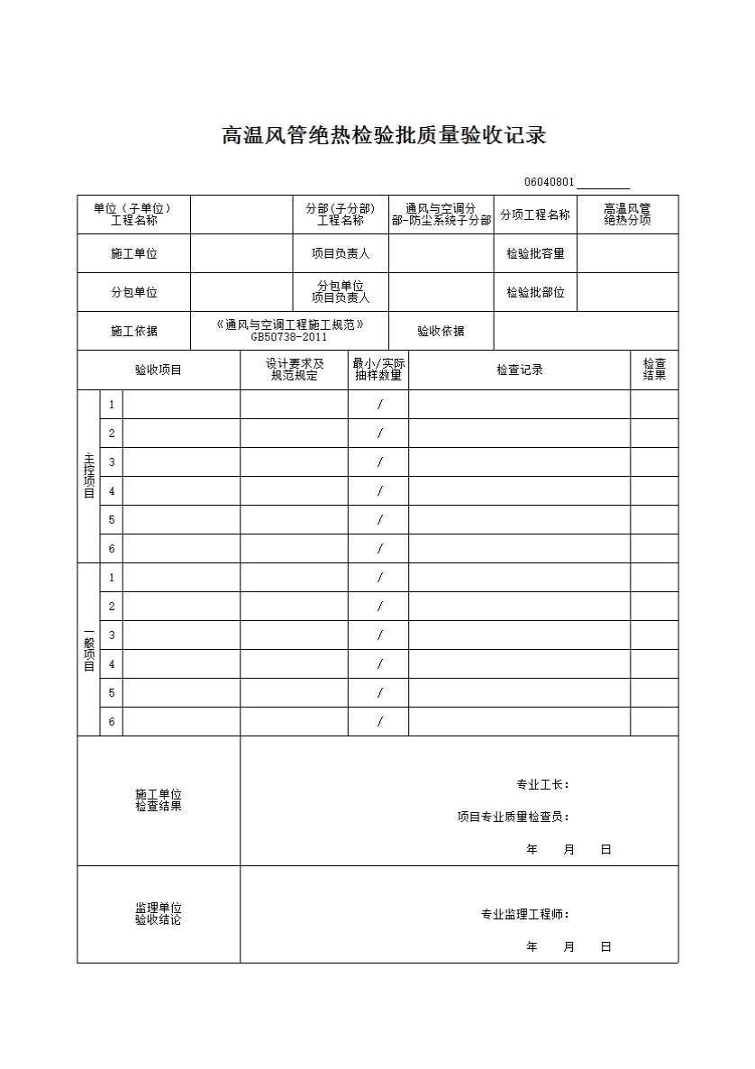 表格名称:06040801_高温风管绝热检验批质量验收记录