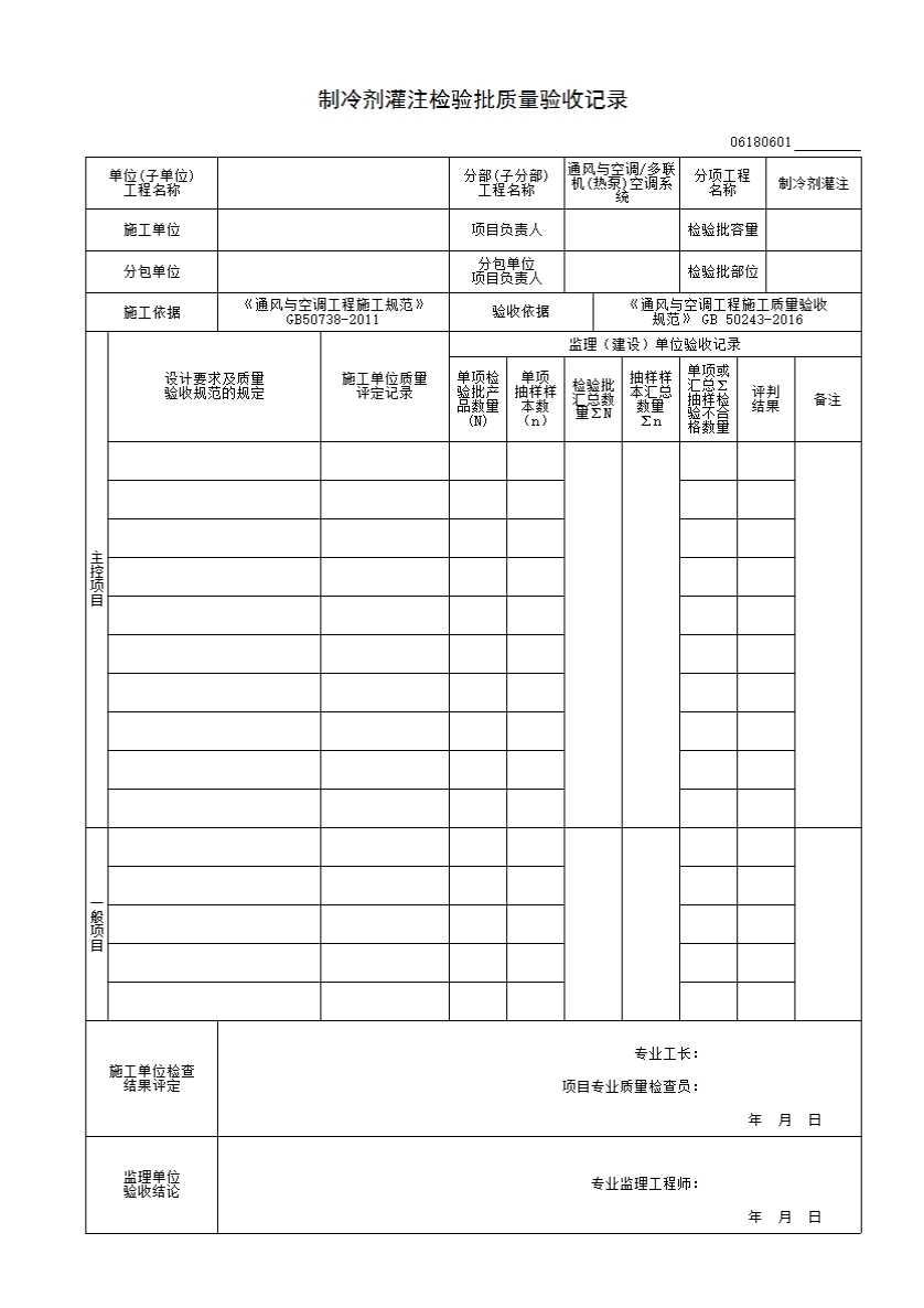 表格名称:06180601_制冷剂灌注检验批质量验收记录