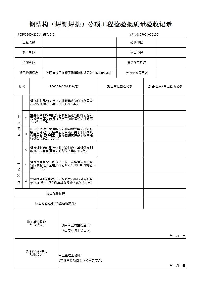 表格名称:钢结构(焊钉焊接)分项工程检验批质量验收记录