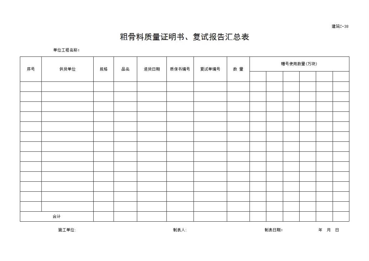 表格名称:C-38_粗骨料质量证明书、复试报告汇总表