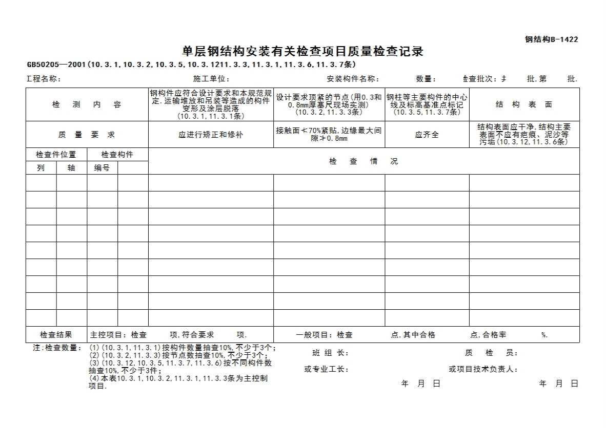 表格名称:单层钢结构安装有关检查项目质量检查记录