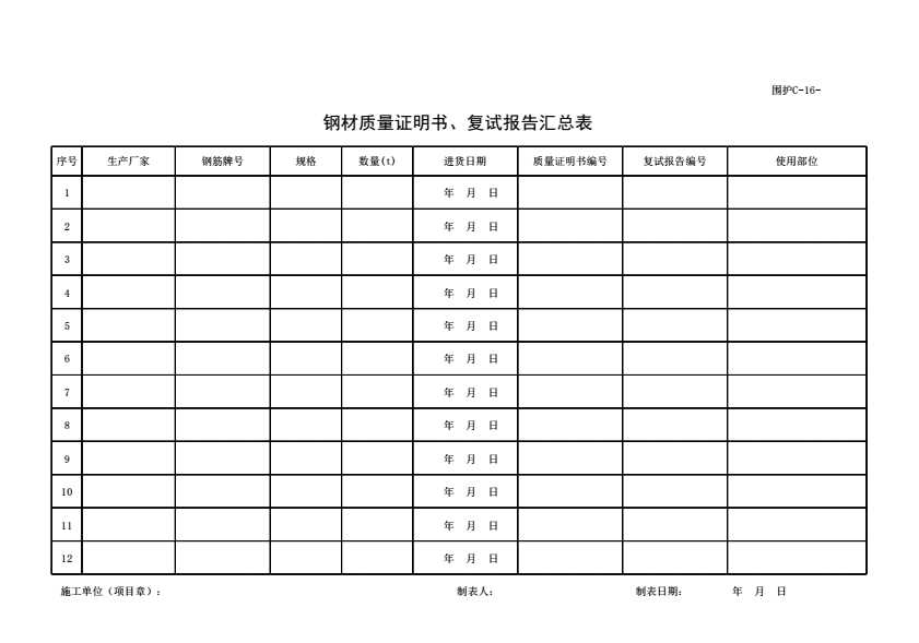 表格名称:围护C-16 钢材质量证明书、复试报告汇总表