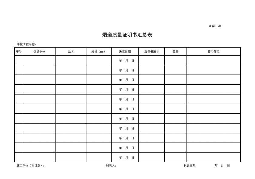 表格名称:建筑C-70 烟道质量证明书汇总表