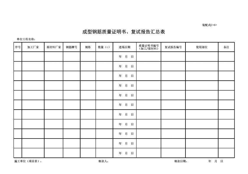 表格名称:装配式C-6 成型钢筋质量证明书、复试报告汇总表