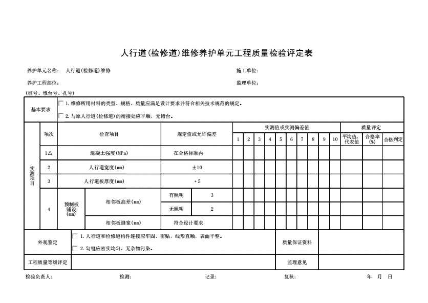 人行道(检修道)维修养护单元工程质量检验评定表