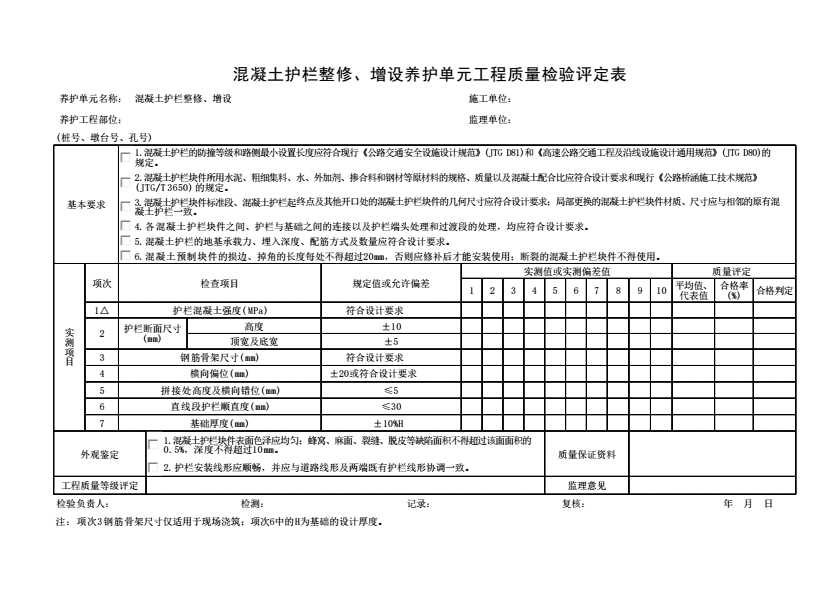混凝土护栏整修、增设养护单元工程质量检验评定表