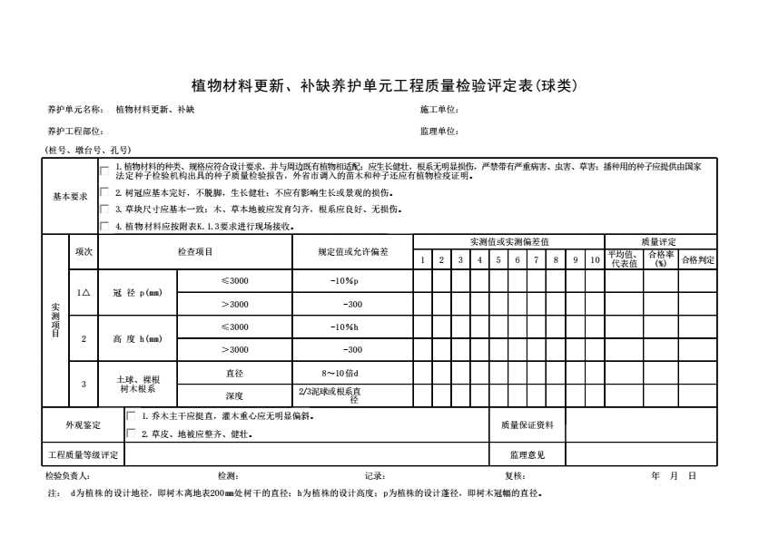 表格名称:植物材料更新、补缺养护单元工程质量检验评定表(球类)