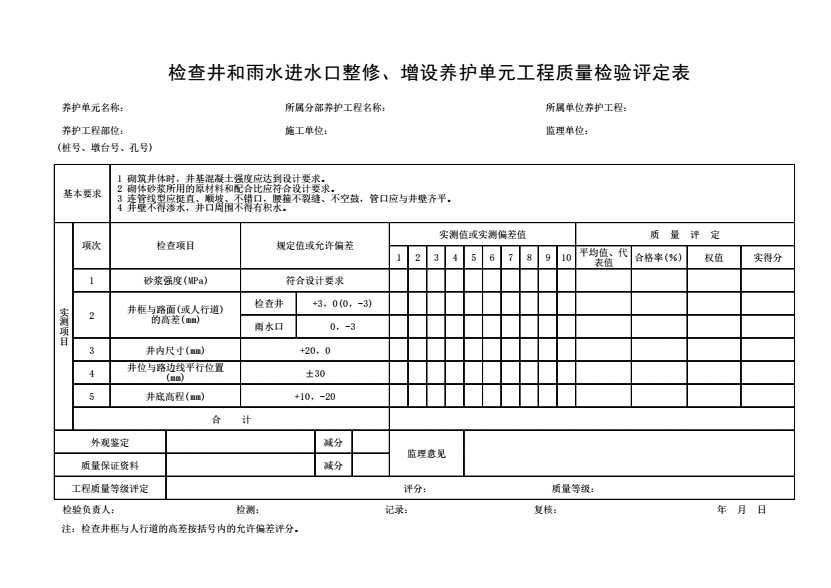 表格名称:检查井和雨水进水口整修、增设养护单元工程质量检验评定表