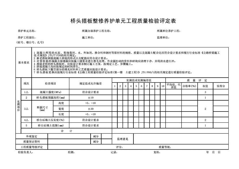 表格名称:桥头搭板整修养护单元工程质量检验评定表