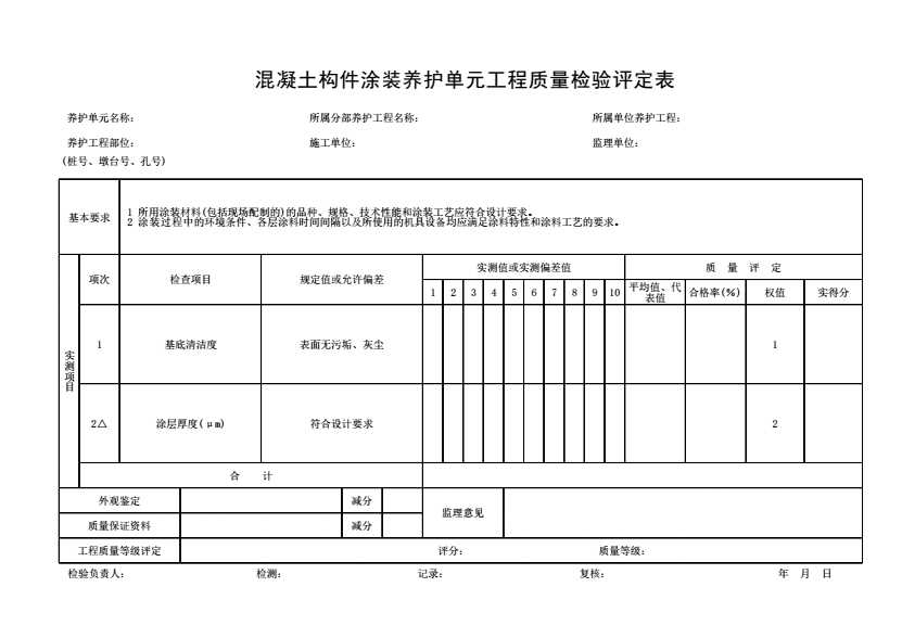 混凝土构件涂装养护单元工程质量检验评定表