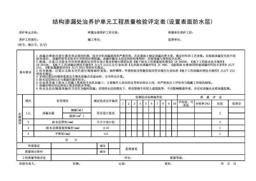 表格名称:结构渗漏处治养护单元工程质量检验评定表(设置表面防水层)