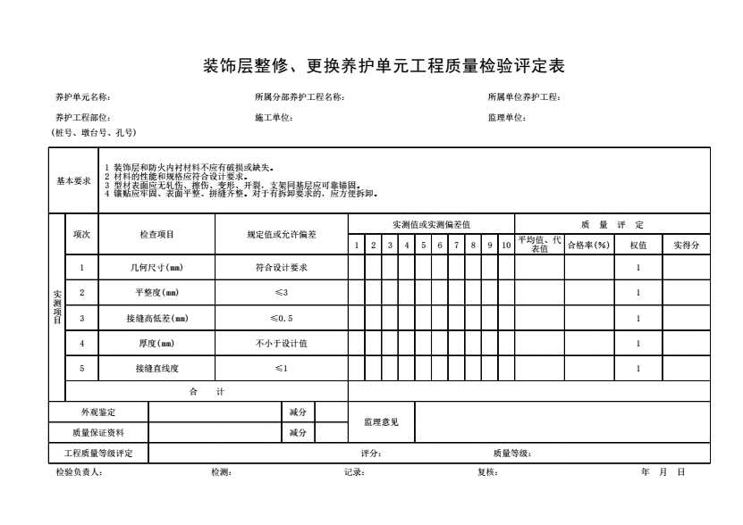 表格名称:装饰层整修、更换养护单元工程质量检验评定表
