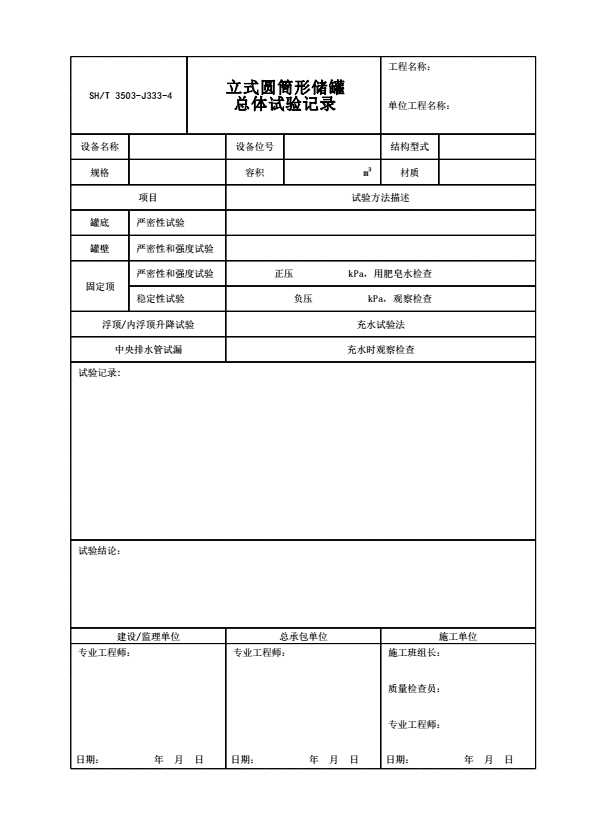 表格名称:SH/T 3503-J333-4 立式圆筒形储罐总体试验记录