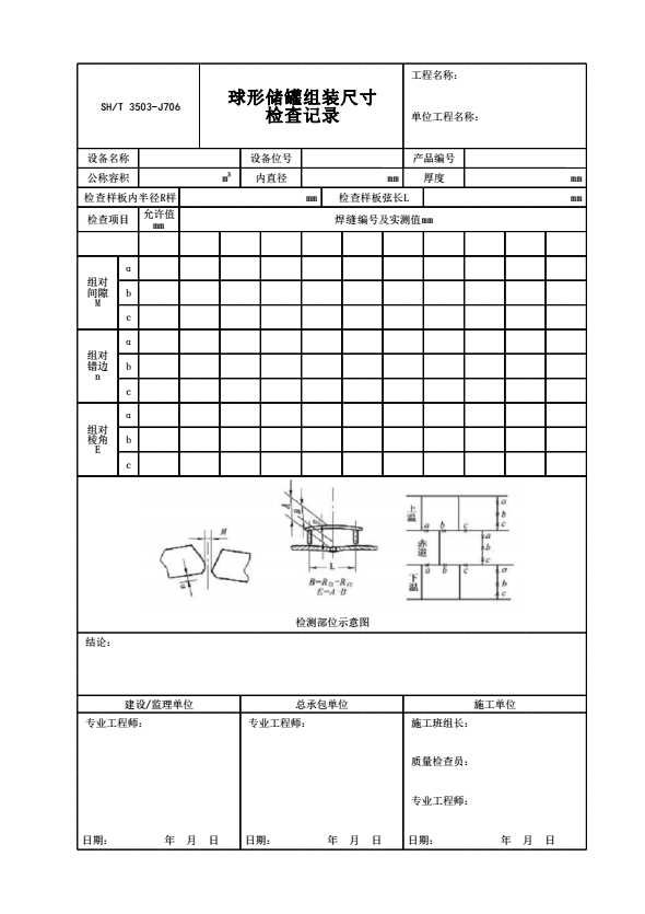 表格名称:SH/T 3503-J706 球形储罐组装尺寸检查记录