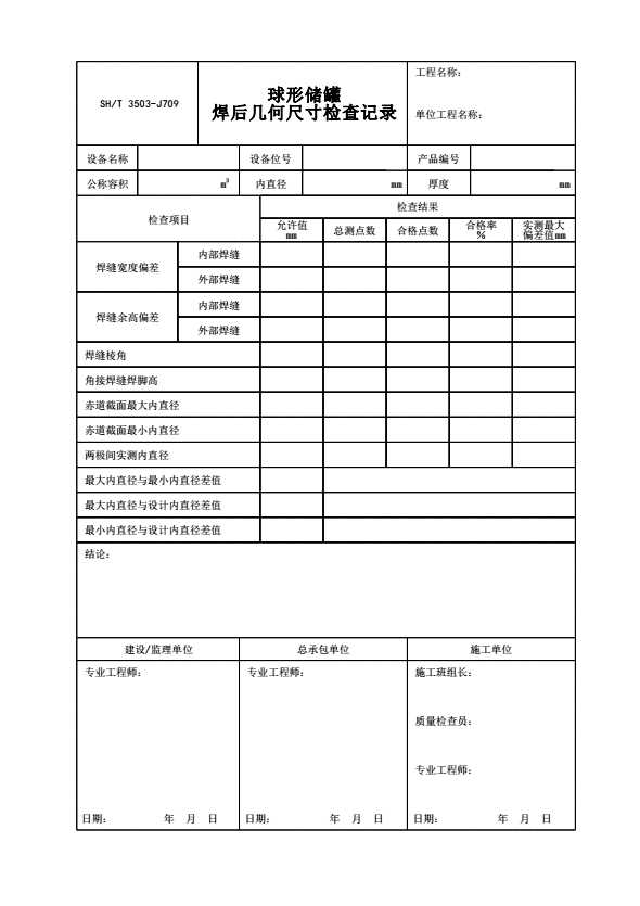 表格名称:SH/T 3503-J709 球形储罐焊后几何尺寸检查记录