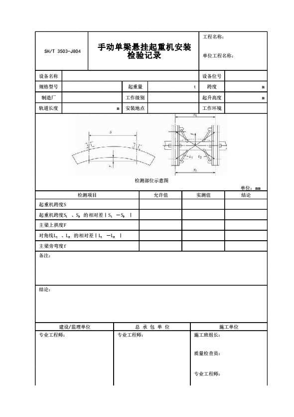表格名称:SH/T 3503-J804 手动单梁悬挂起重机安装检验记录