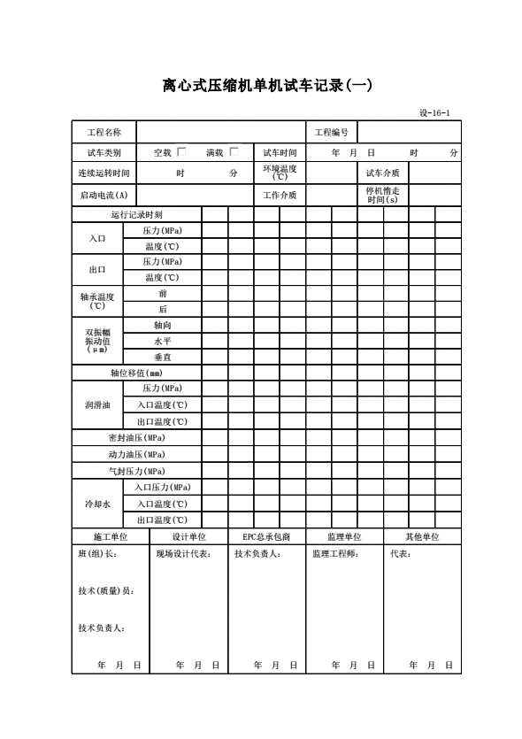 表格名称:设-16-1 离心式压缩机单机试车记录(一)