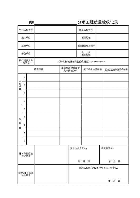 表格名称:附录B 焦化机械设备安装分项工程质量验收记录