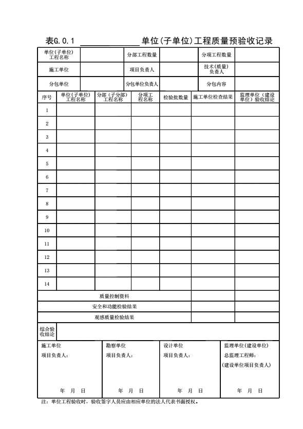 表格名称:表G.0.1 单位(子单位)工程质量预验收记录
