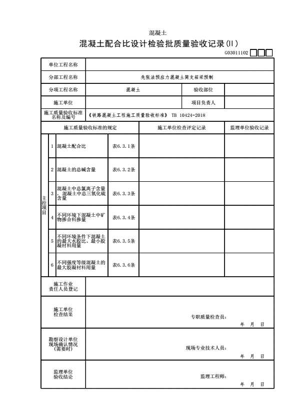 表格名称:G03011102 【混凝土】混凝土配合比设计检验批质量验收记录(Ⅱ)