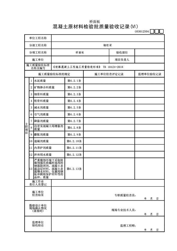 表格名称:G03012504 【桥面板】混凝土原材料检验批质量验收记录(Ⅵ)