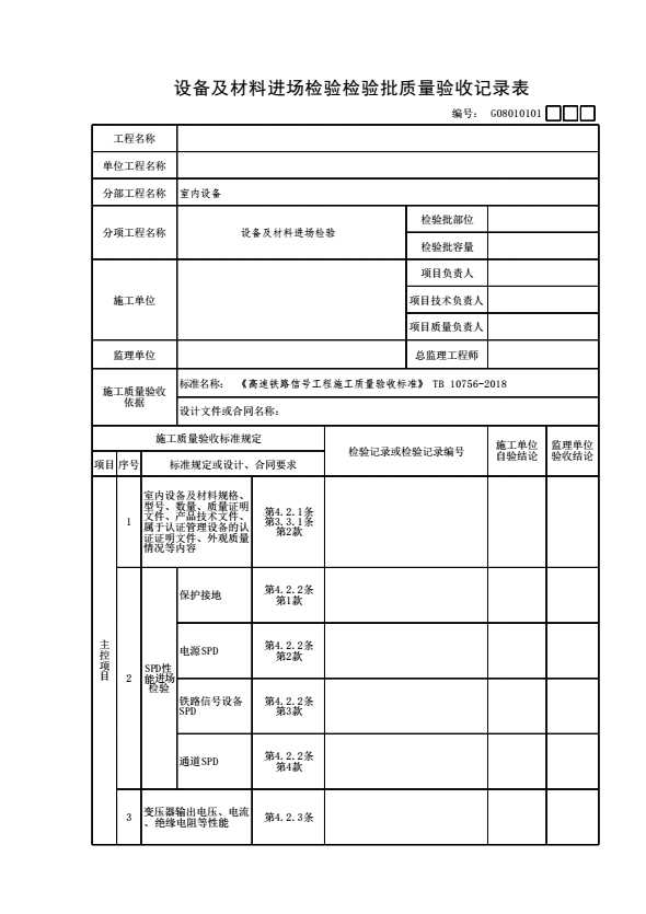 表格名称:G08010101 设备及材料进场检验检验批质量验收记录表