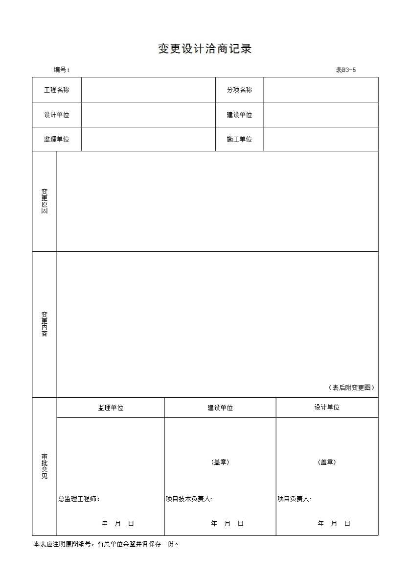 表格名称:表B3-5 变更设计洽商记录