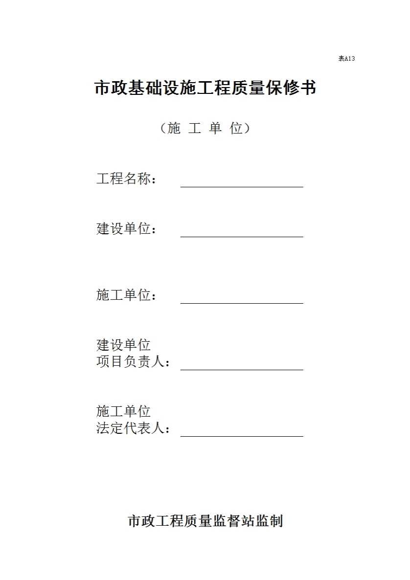 表格名称:表A13 市政基础设施工程质量保修书