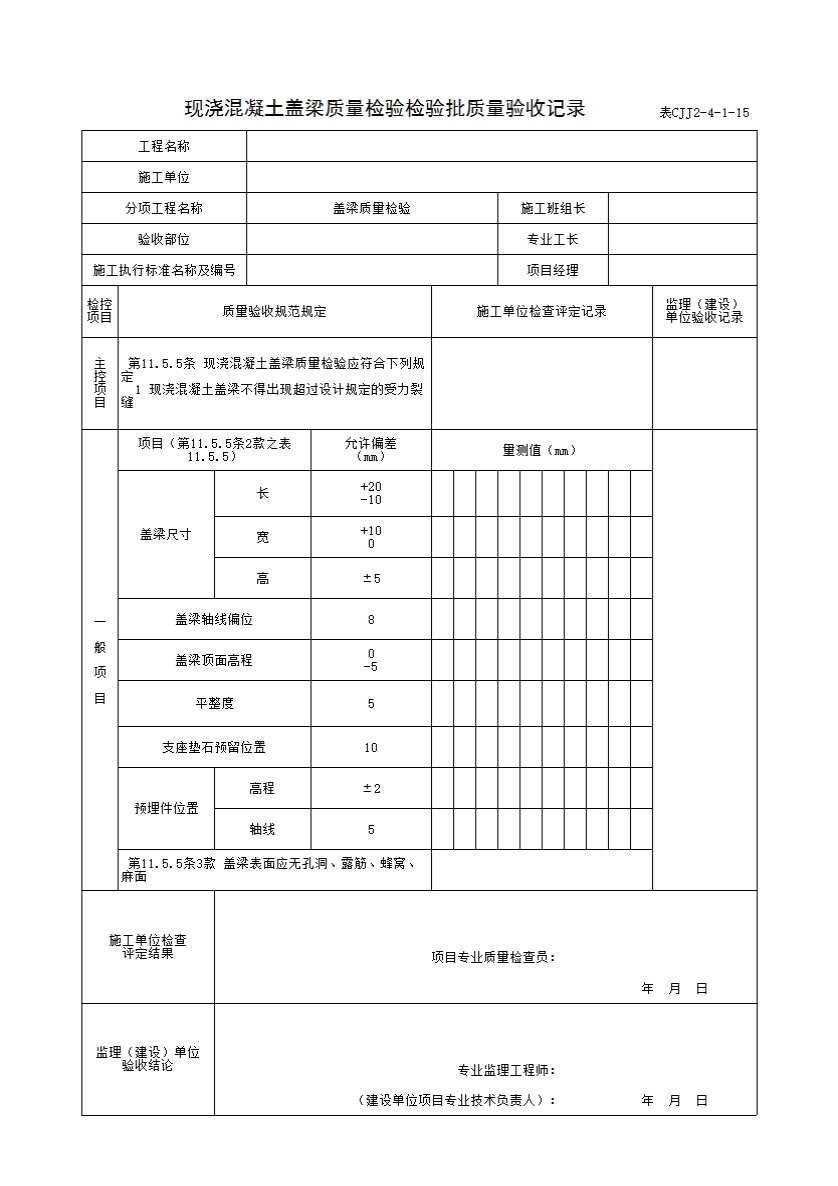 表格名称:表CJJ2-4-1-15 现浇混凝土盖梁质量检验检验批质量验收记录