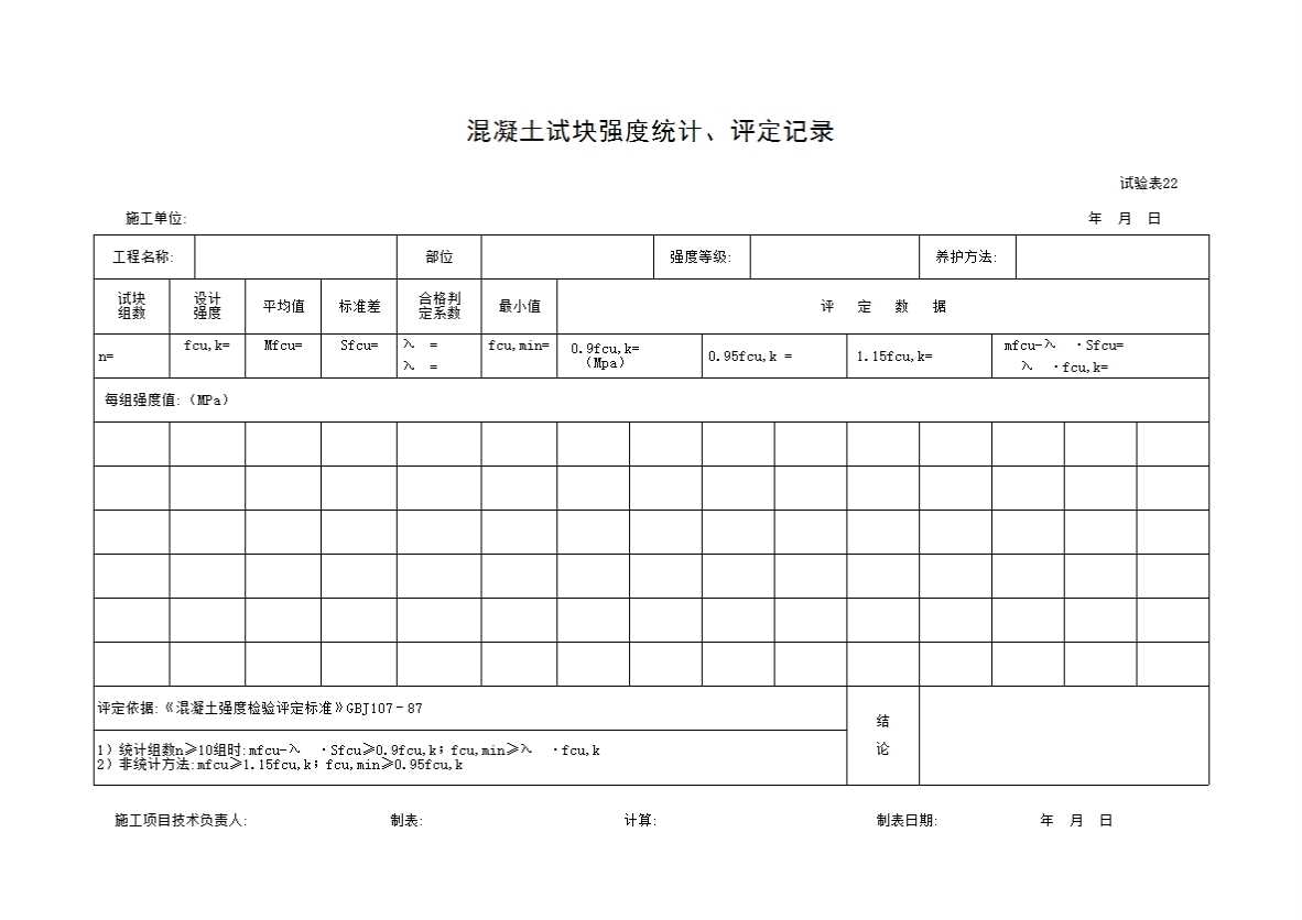 表格名称:试验表22 混凝土试块强度统计、评定记录