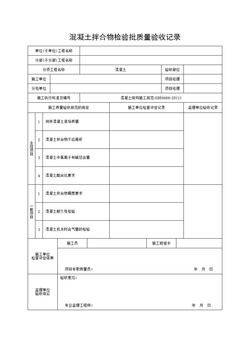 表格名称:混凝土拌合物检验批质量验收记录