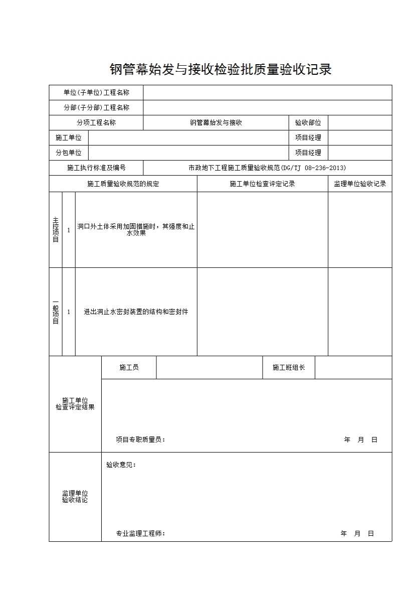 表格名称:钢管幕始发与接收检验批质量验收记录