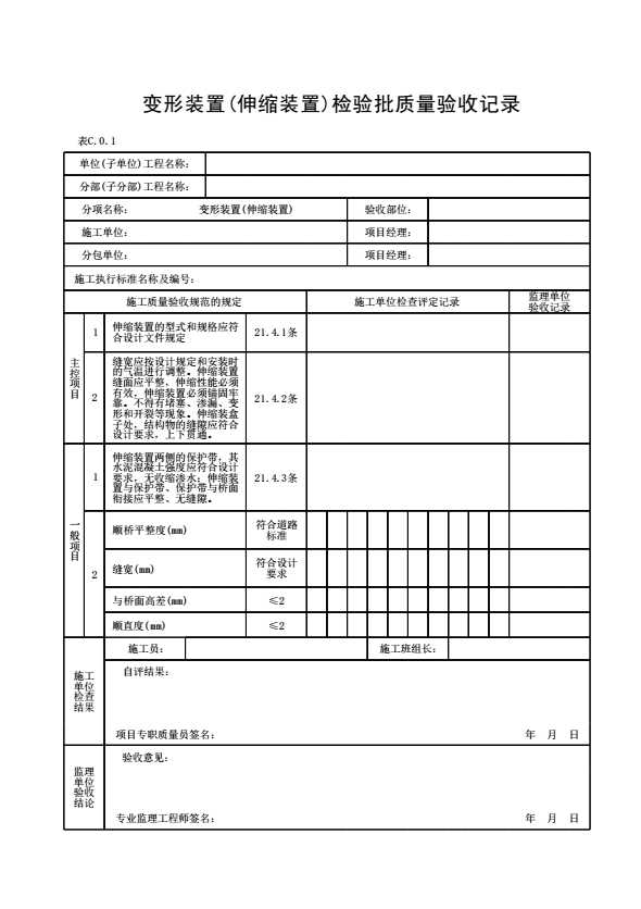 表格名称:变形装置(伸缩装置)检验批质量验收记录