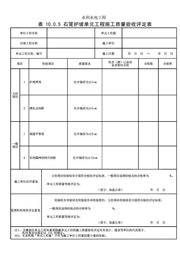 表格名称:表 10.0.5 石笼护坡单元工程施工质量验收评定表