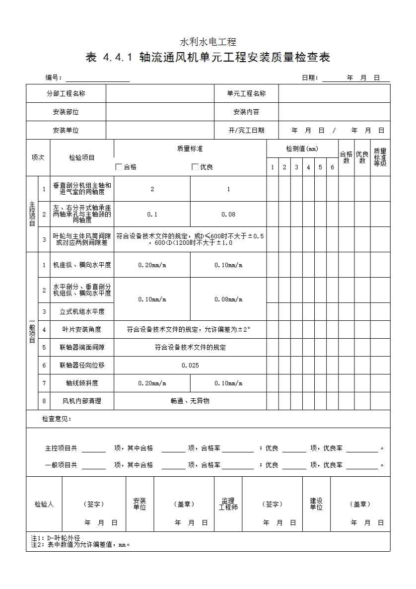 表格名称:表 4.4.1 轴流通风机单元工程安装质量检查表