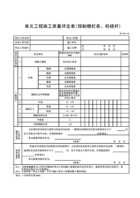 表格名称:单元工程施工质量评定表(预制栅栏条、杩槎杆)