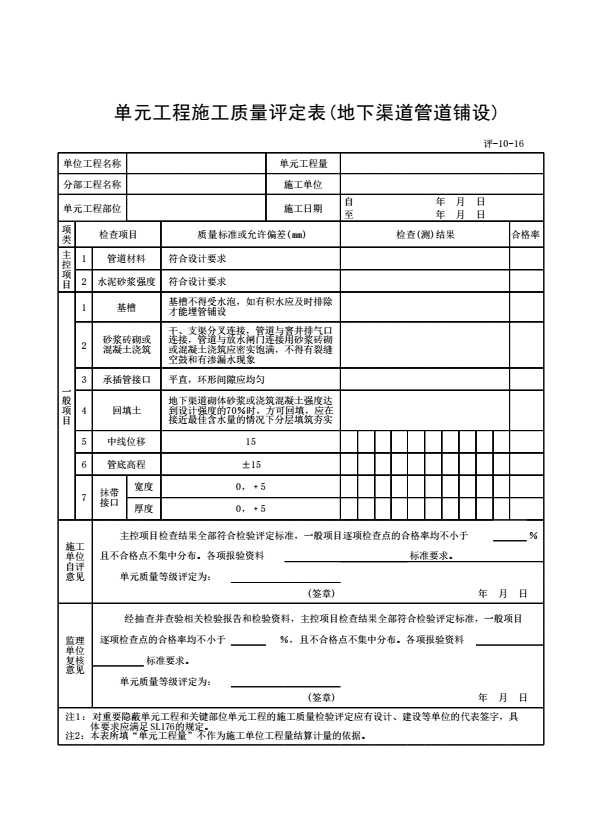 表格名称:单元工程施工质量评定表(地下渠道管道铺设)