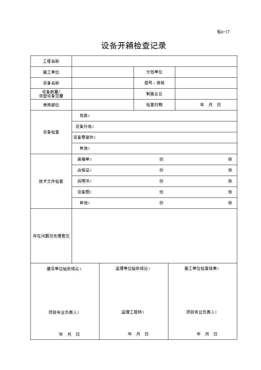 表格名称:17、(评A-17)设备开箱检查记录