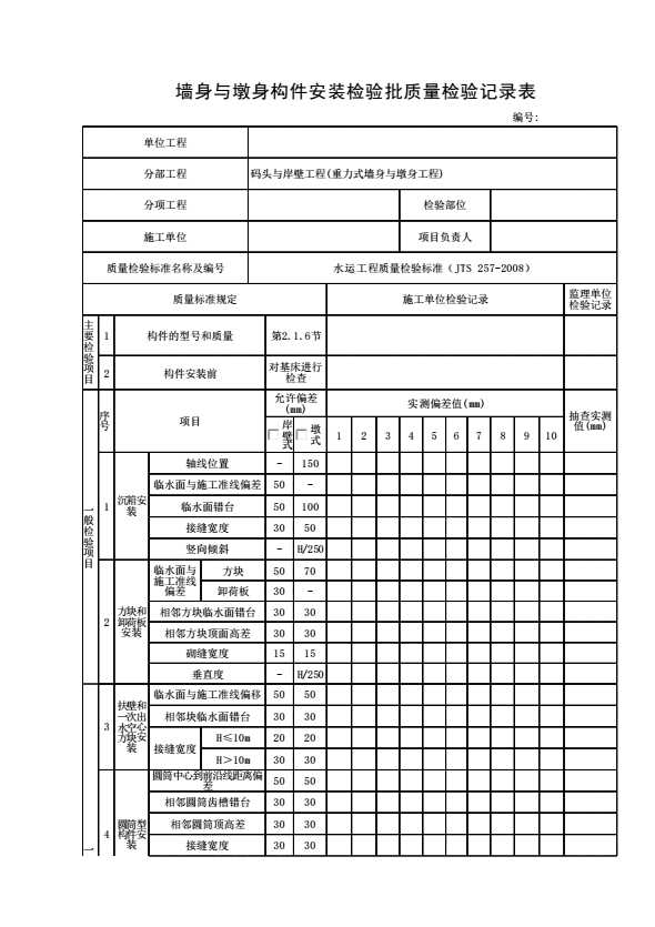 表格名称:墙身与墩身构件安装检验批质量检验记录表