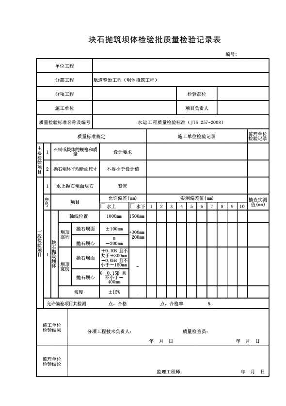 表格名称:块石抛筑坝体检验批质量检验记录表