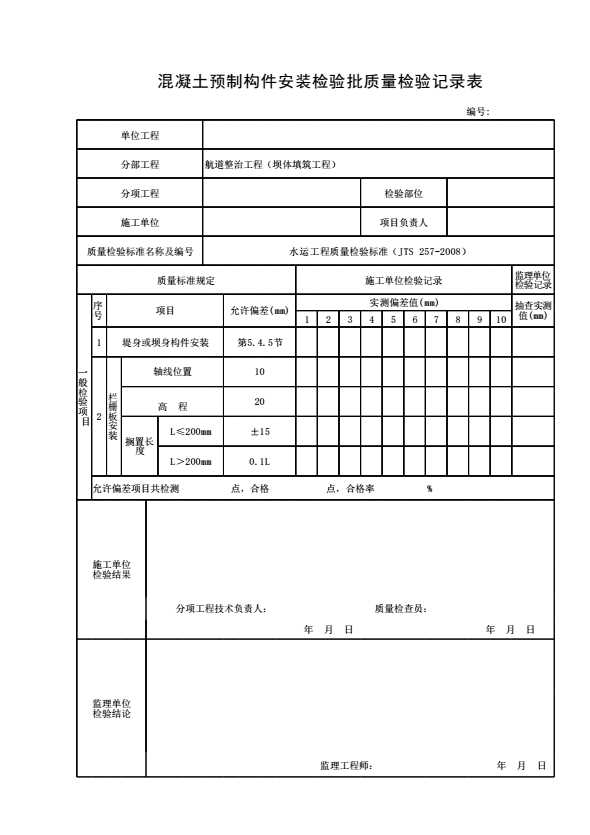 表格名称:混凝土预制构件安装检验批质量检验记录表