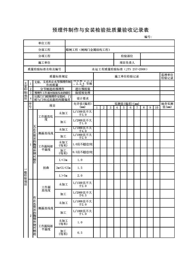 预埋件制作与安装检验批质量验收记录表