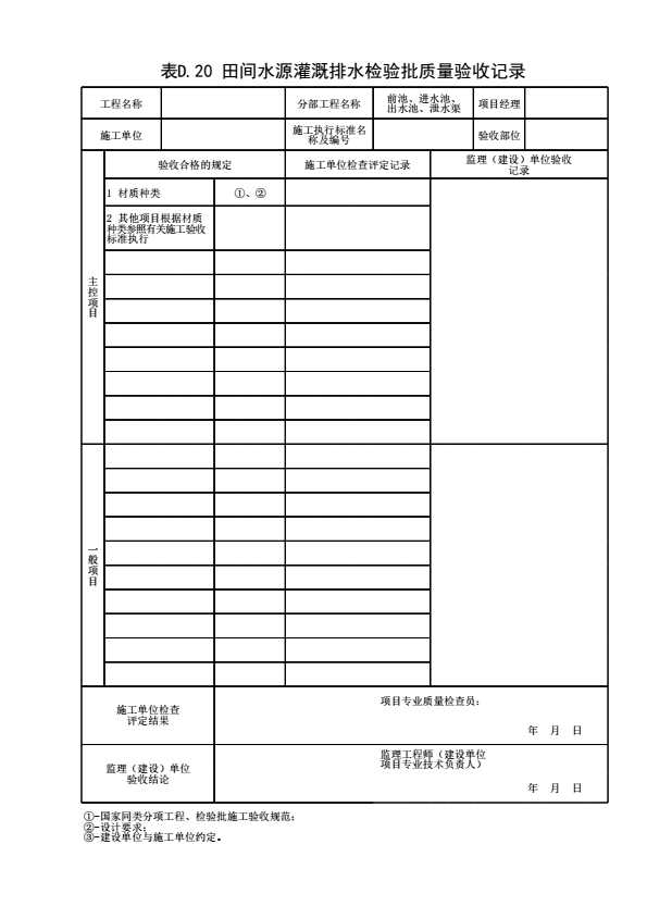 表格名称:表D.20 田间水源灌溉排水检验批质量验收记录