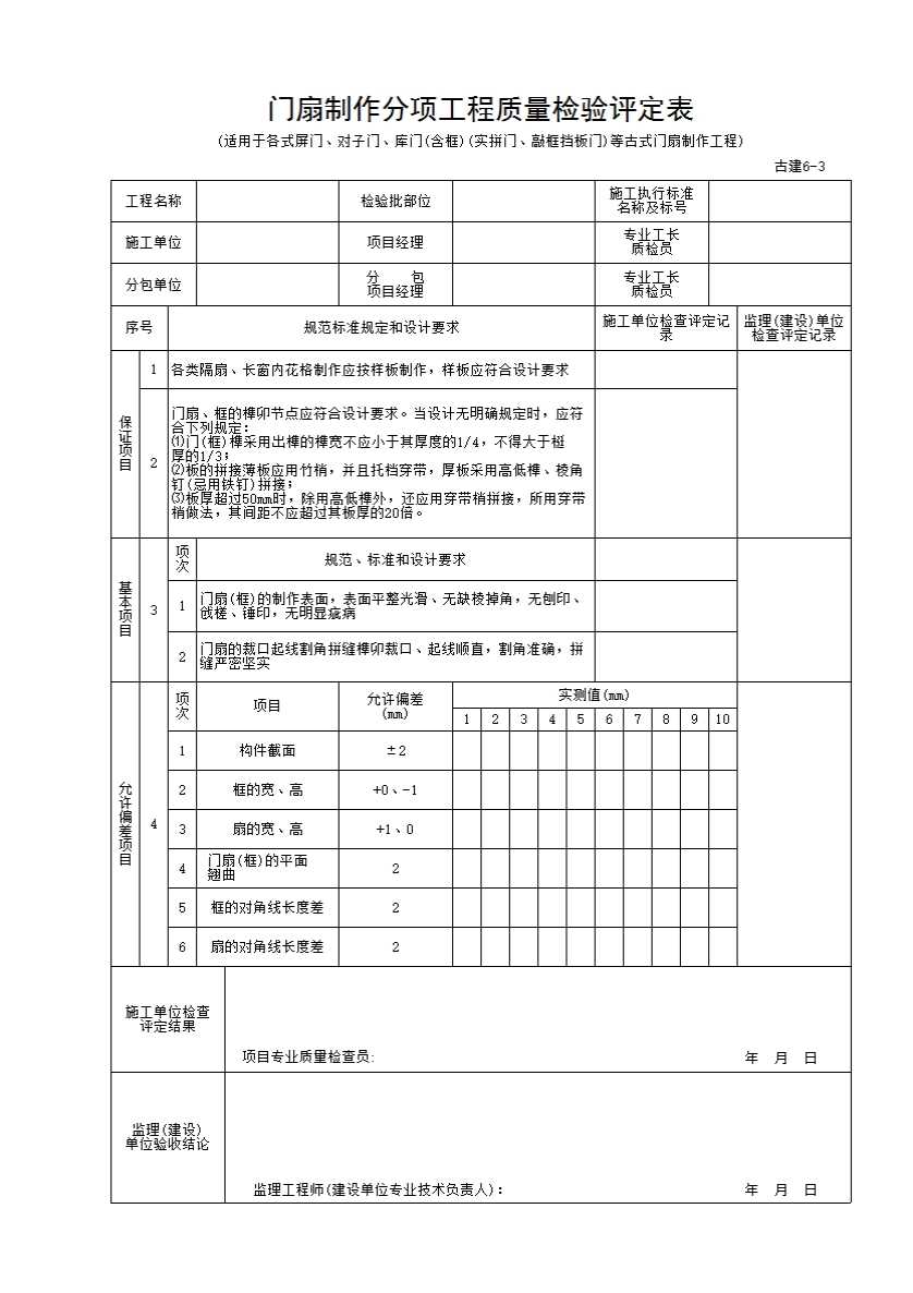 表格名称:古建6-3 门扇制作分项工程质量检验评定表