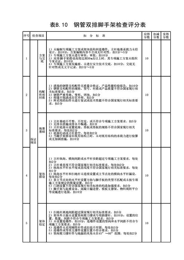 表格名称:表B.10 钢管双排脚手架检查评分表