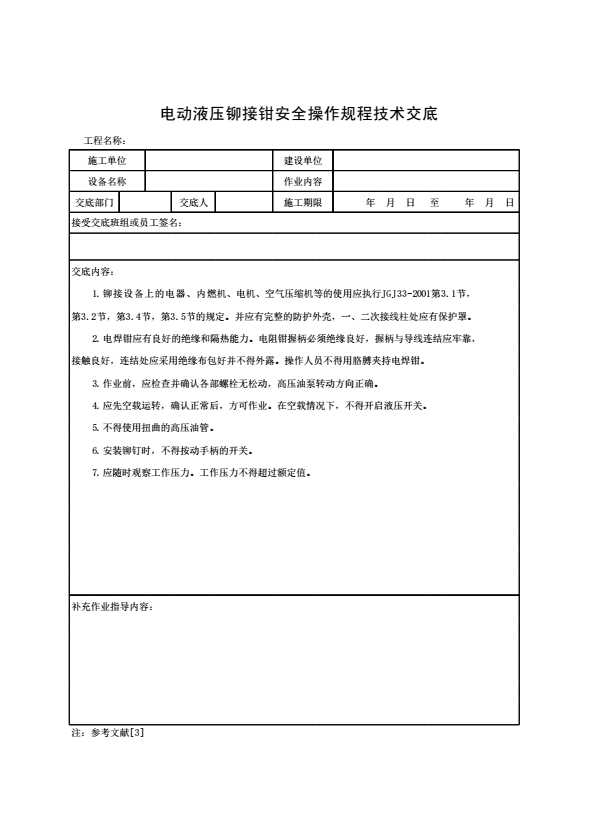 表格名称:电动液压铆接钳安全操作规程技术交底