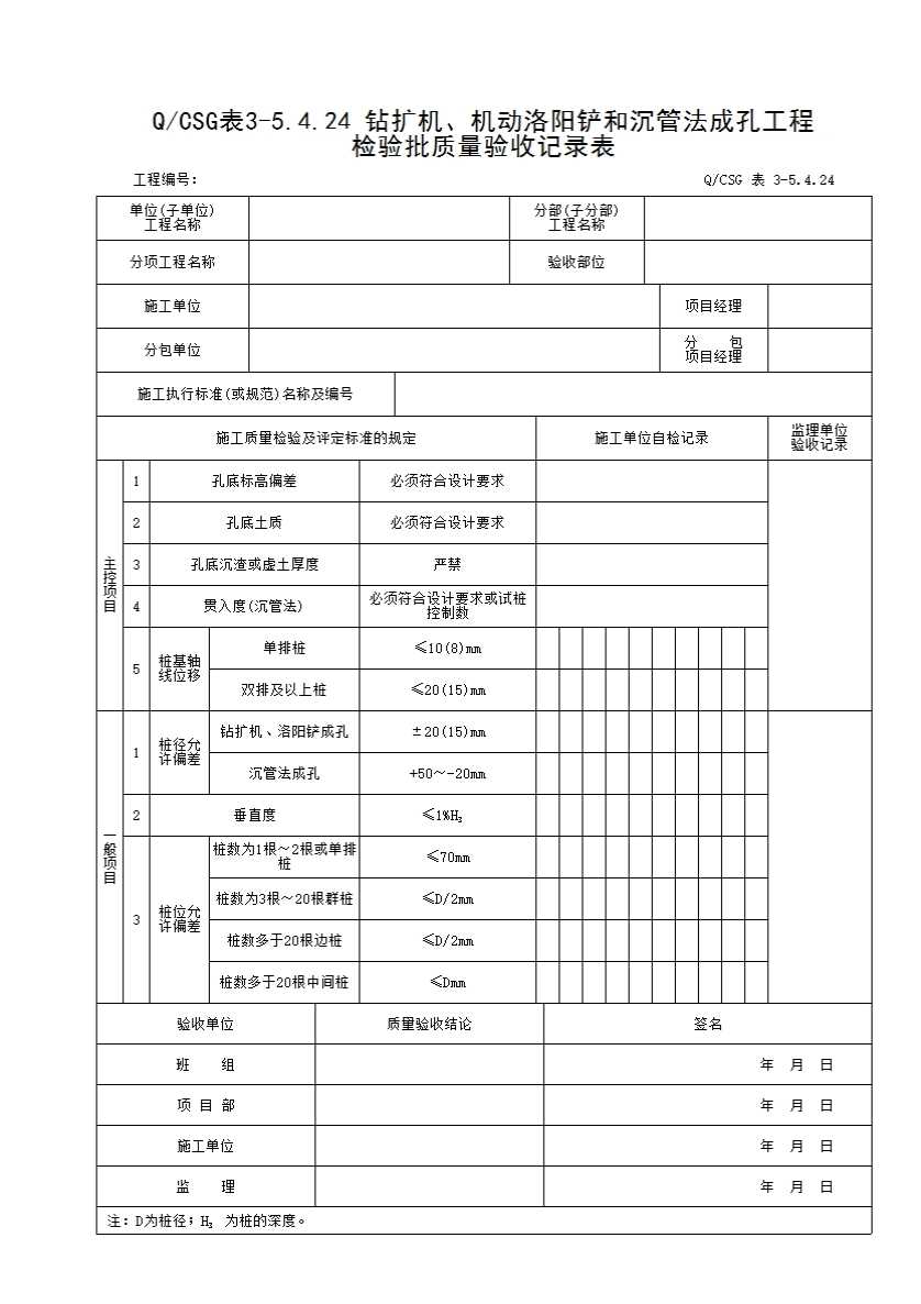 表格名称:QCSG 表 3-5.4.24 钻扩机、机动洛阳铲和沉管法成孔工程检验批质量验收记录表
