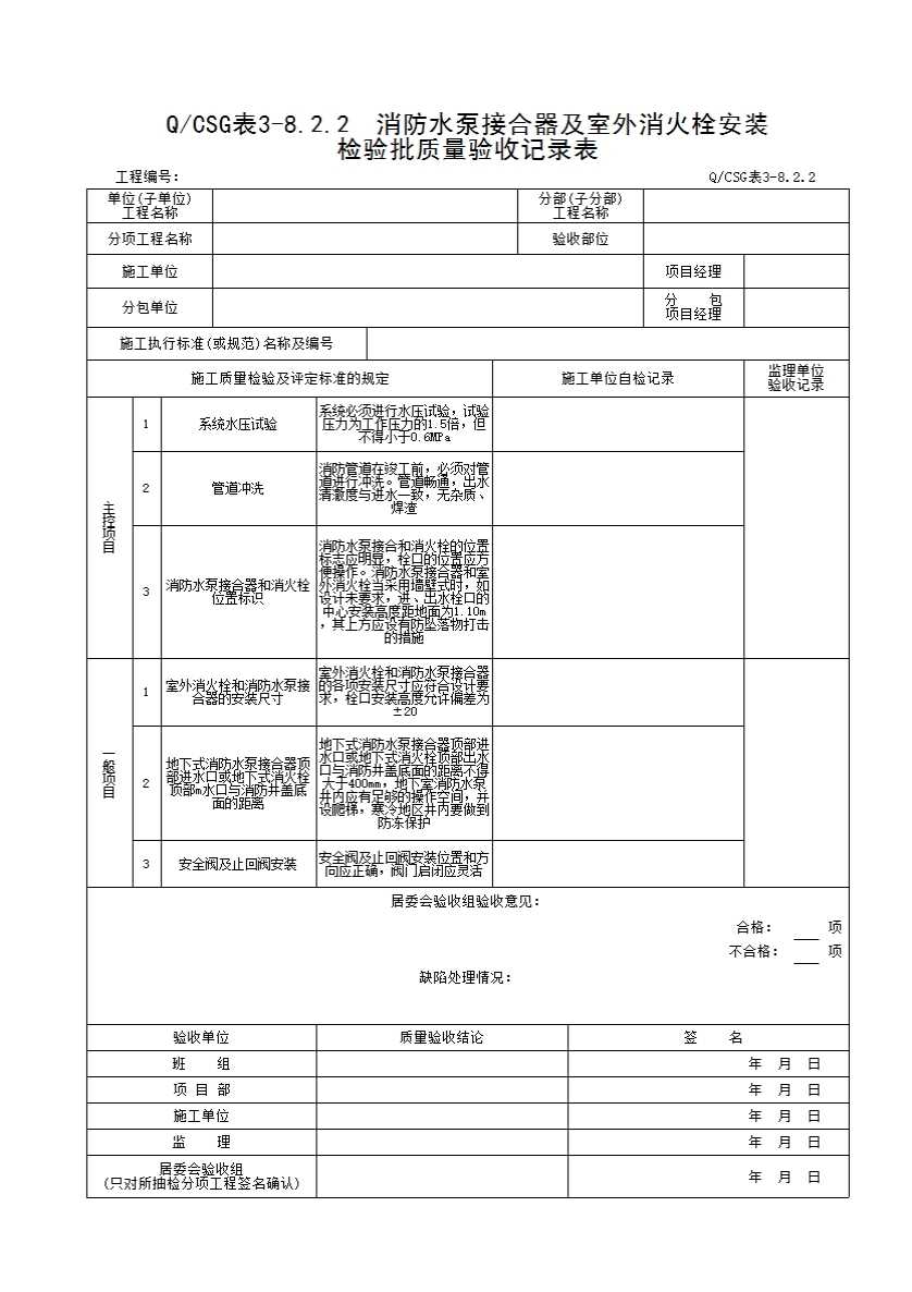 表格名称:QCSG 表 3-8.2.2 消防水泵接合器及室外消火栓安装检验批质量验收记录表