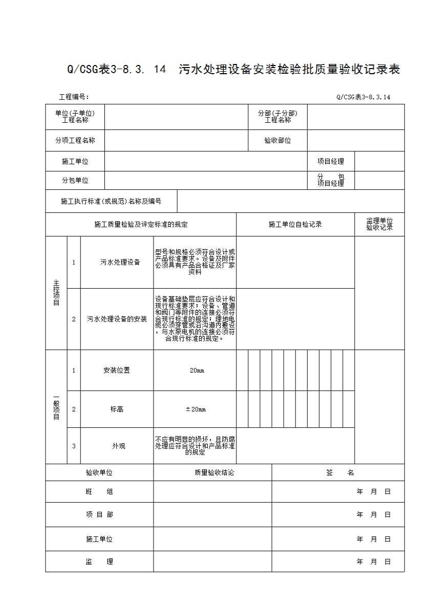 QCSG 表 3-8.3.14 污水处理设备安装检验批质量验收记录表